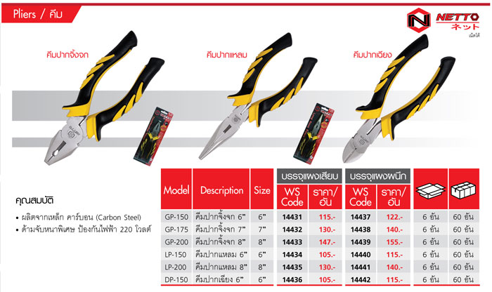14435 รุ่น LP-200 คีมปากแหลม 8 นิ้ว บรรจุแผงเสียบ เน็ตโต้ NETTO