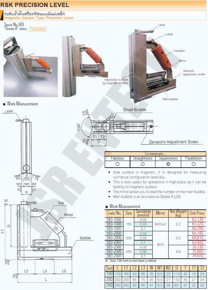583-2502,583-2505,583-2501 ระดับน้ำตั้งเครื่องจักรแบบมีแม่เหล็ก Size 250 อาร์เอสเค RSK