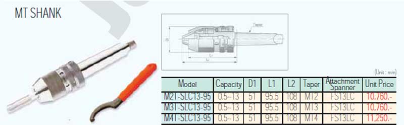 M2T-SLC13-95,M3T-SLC13-95,M4T-SLC13-95, หัวจับดอกสว่าน-ดอกต๊าปกลียว MT SHANK 0.5x13 mm. YUKIWA