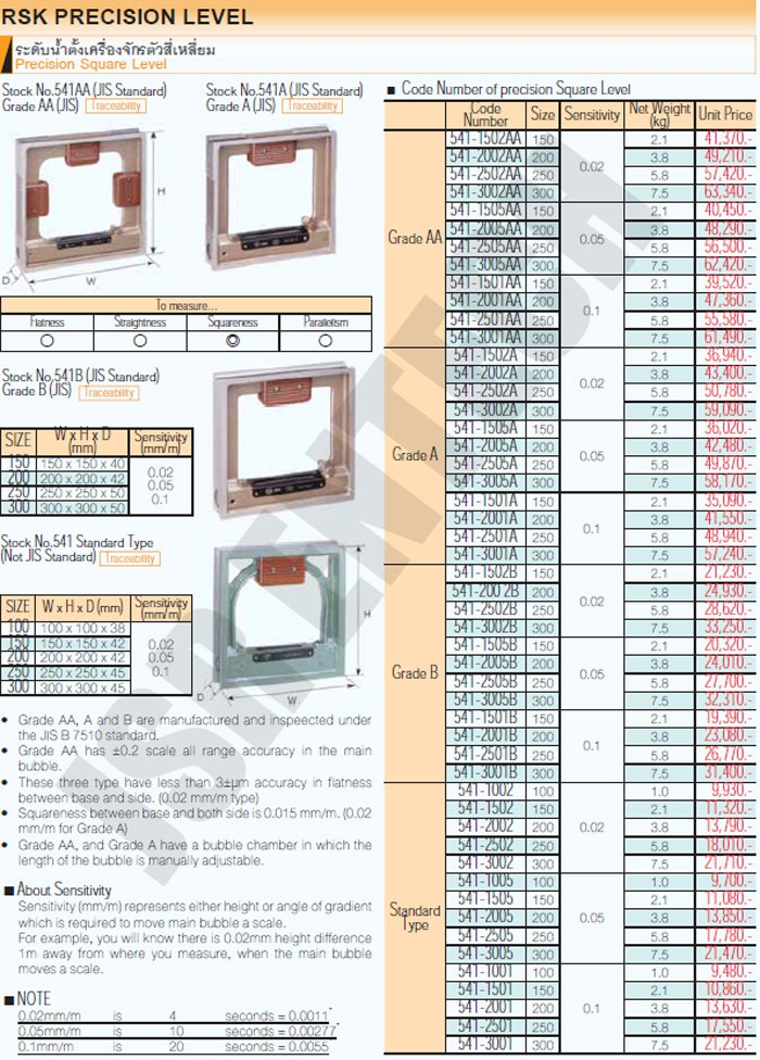 541-1001,541-1501,541-2001,541-2501,541-3001 ระดับน้ำตั้งเครื่องจักรตัวสี่เหลี่ยม Size 100,150,200,250,300 อาร์เอสเค RSK