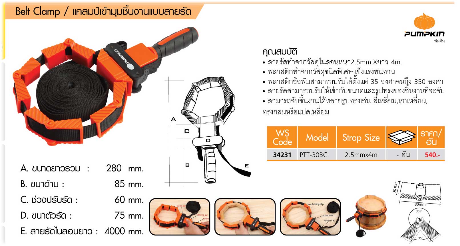 34231 แคลมป์เข้ามุมชิ้นงานแบบสายรัด PTT-30BC พัมคิน Pumpkin