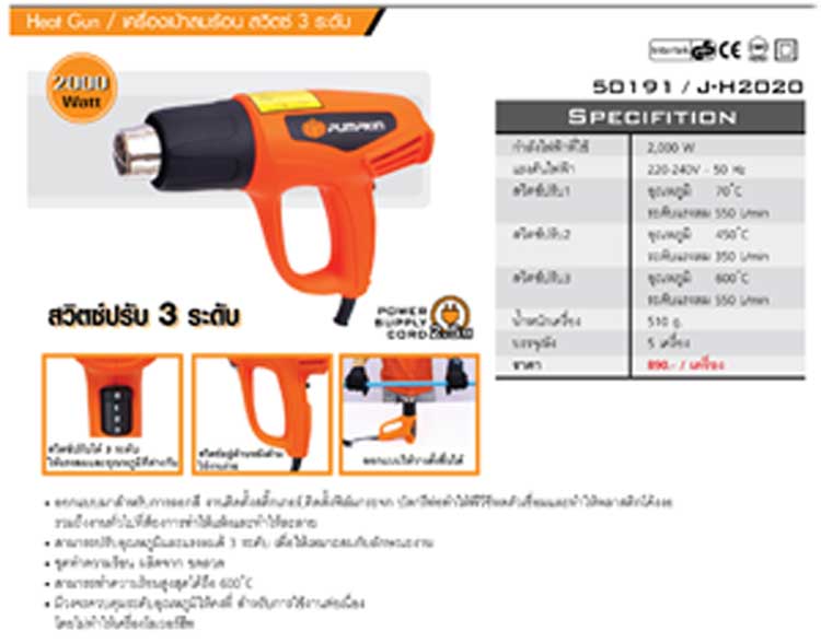 - ออกแบบมาสำหรับการลอกสี งานติดสติกกอร์ ติดตั้งสติกเกอร์ ติดตั้งฟิล์มกระจก บัดกรีท่อทำให้พีวีซีหดตัวเชื่อมและทำให้พลาสติกโค้กงอ รวมถึงงานทั่วไปที่ต้องการทำให้แห้งและทำให้ละลาย